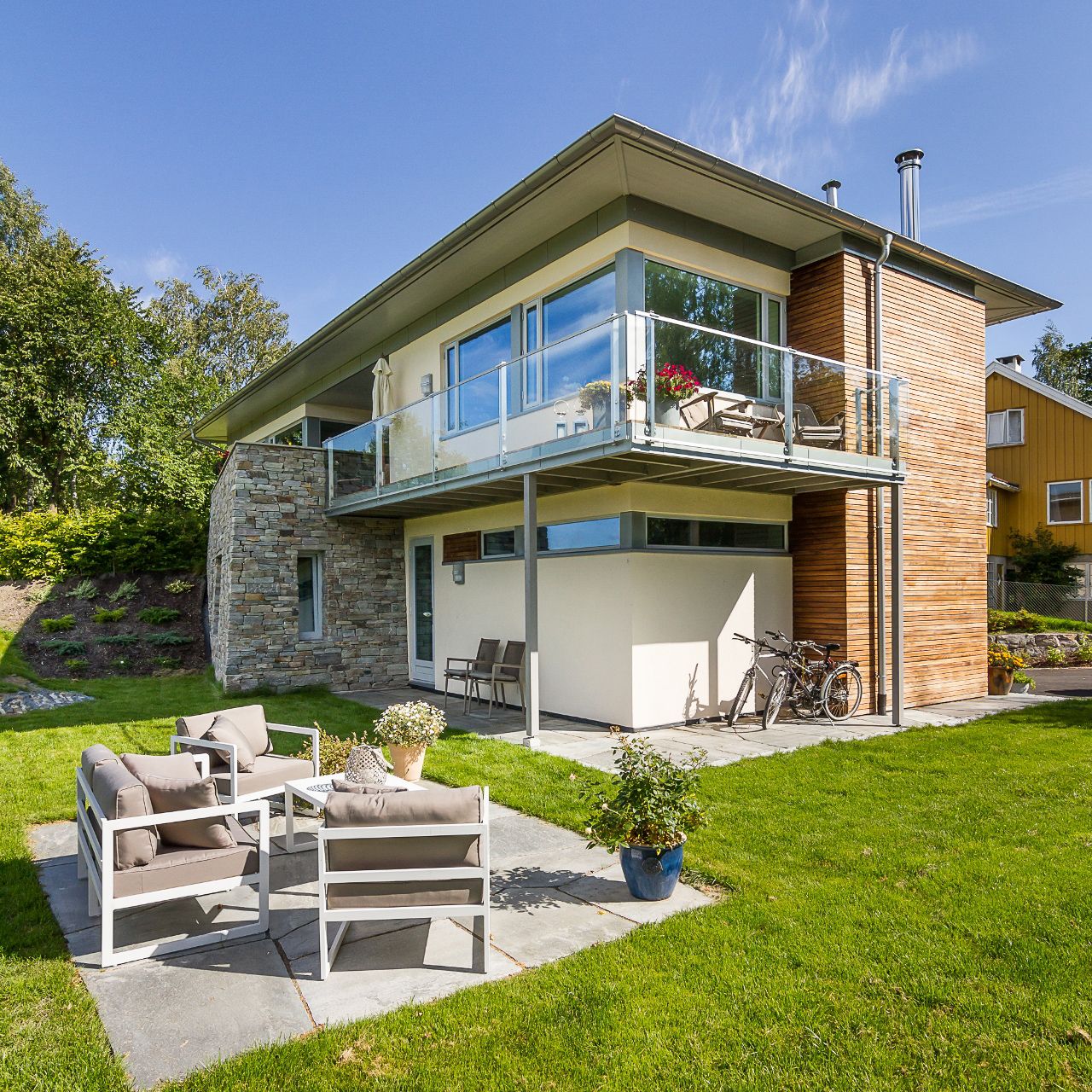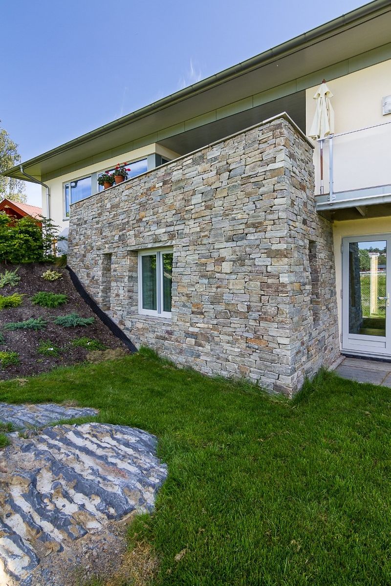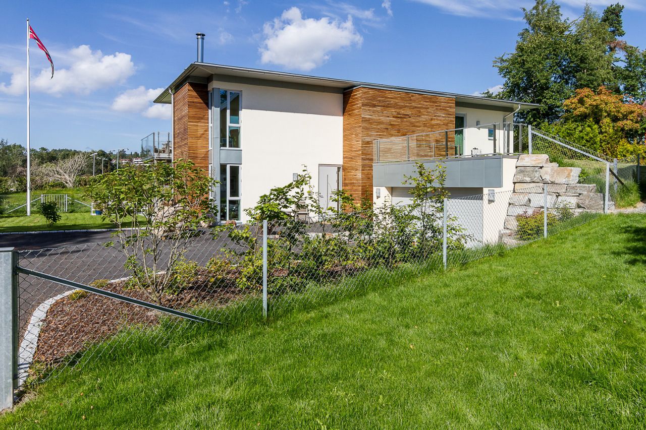 Eneboligen på Jar ble utviklet i tett samarbeid med byggherre, hvor det ble fokusert på bruk av ulike fasadematerialer som gir et spennende og variert uttrykk. Boligen møter bakken med naturlige materialer som tar opp omgivelsene rundt. Den varme trekledningen står i god kontrast til den pussede fasaden og den steinbelagte basen. Boligen går over to plan med stor terrasse i 2. etasje og garasje under terreng.