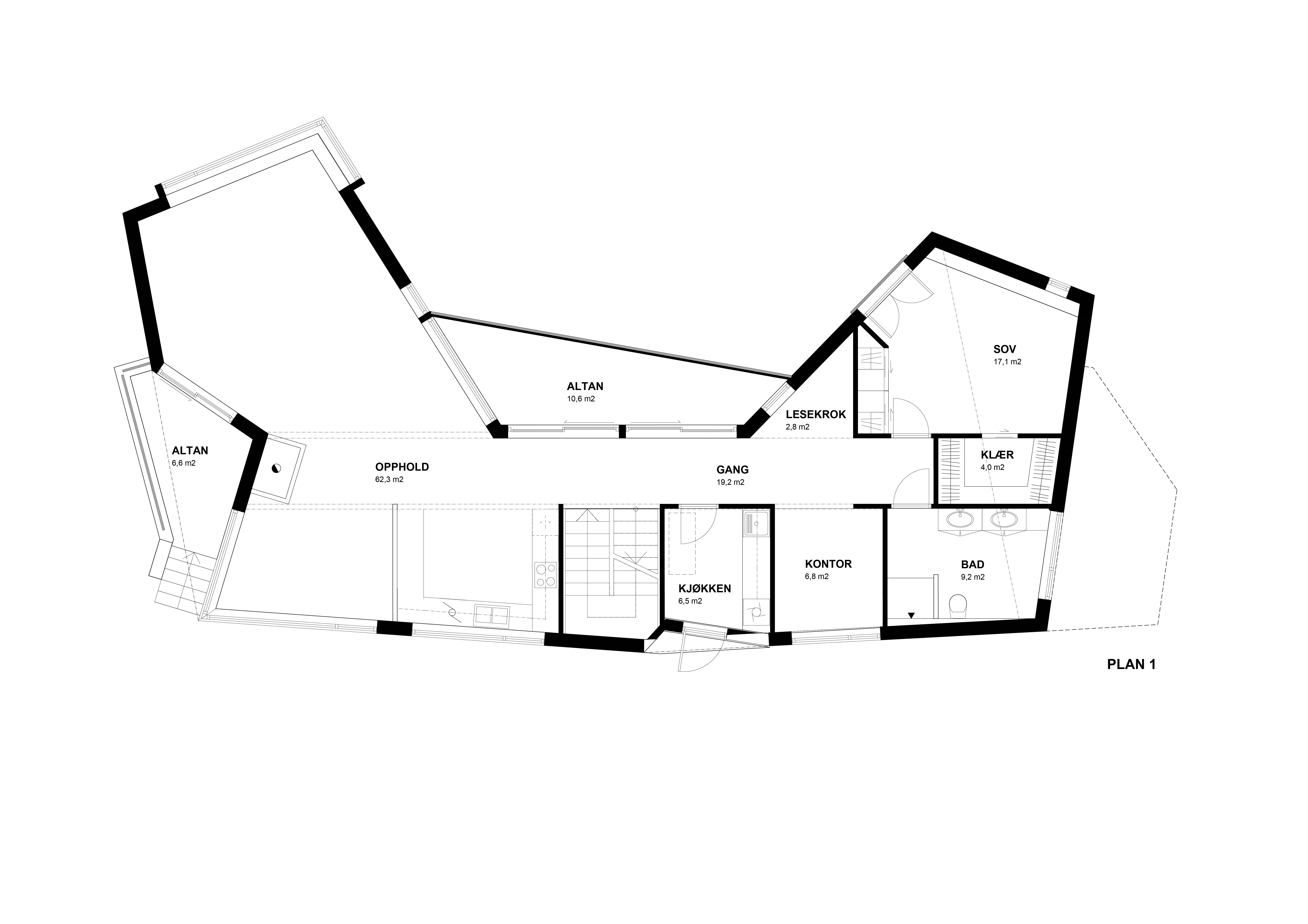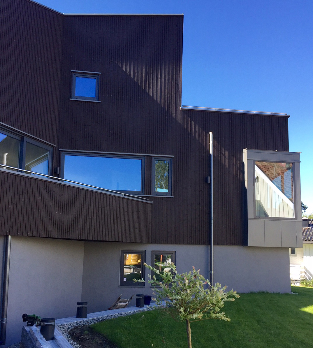Prosjektet omfatter oppføring av en enebolig på Nordstrand, i et etablert småhusområde med variert boligstruktur. Tomten ligger lett tilbaketrukket fra veien, og bebyggelsen følger mønsteret i nabolaget med boligvolum plassert inn på eiendommen og garasje vendt mot vei. Boligen er utformet med tydelig tilpasning til stedets topografi og omgivelser. Volum, høyde og proporsjoner harmonerer med nabobebyggelse, samtidig som huset har et moderne arkitektonisk uttrykk. Bygget åpner seg mot nord og vest med gode utsikts- og uteoppholdsarealer, mens fasadene mot nærmeste naboer er mer tilbaketrukne og dempede. Materialbruken er robust og stedstilpasset, med stående mørk trekledning, innslag av naturstein og sedumtak.