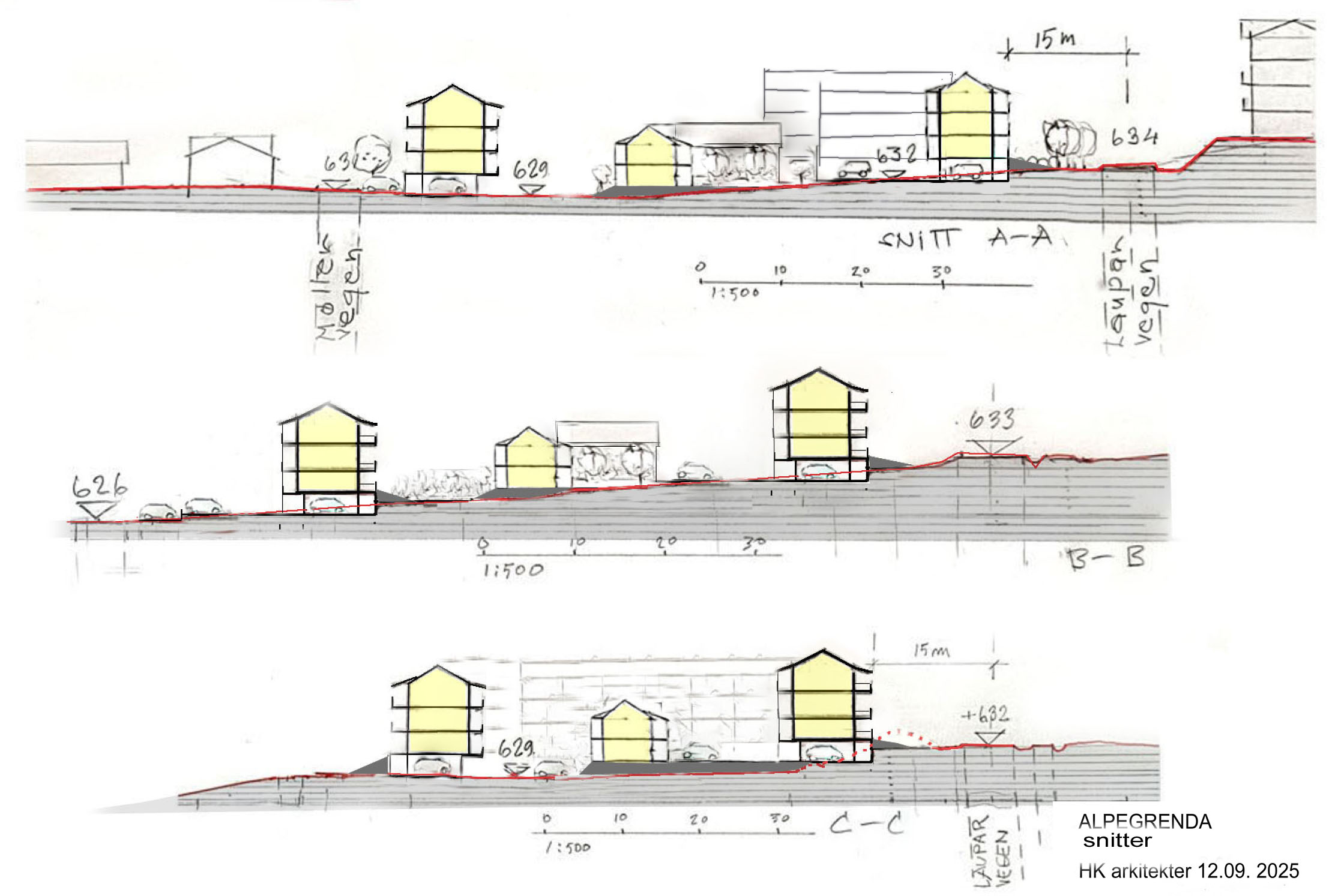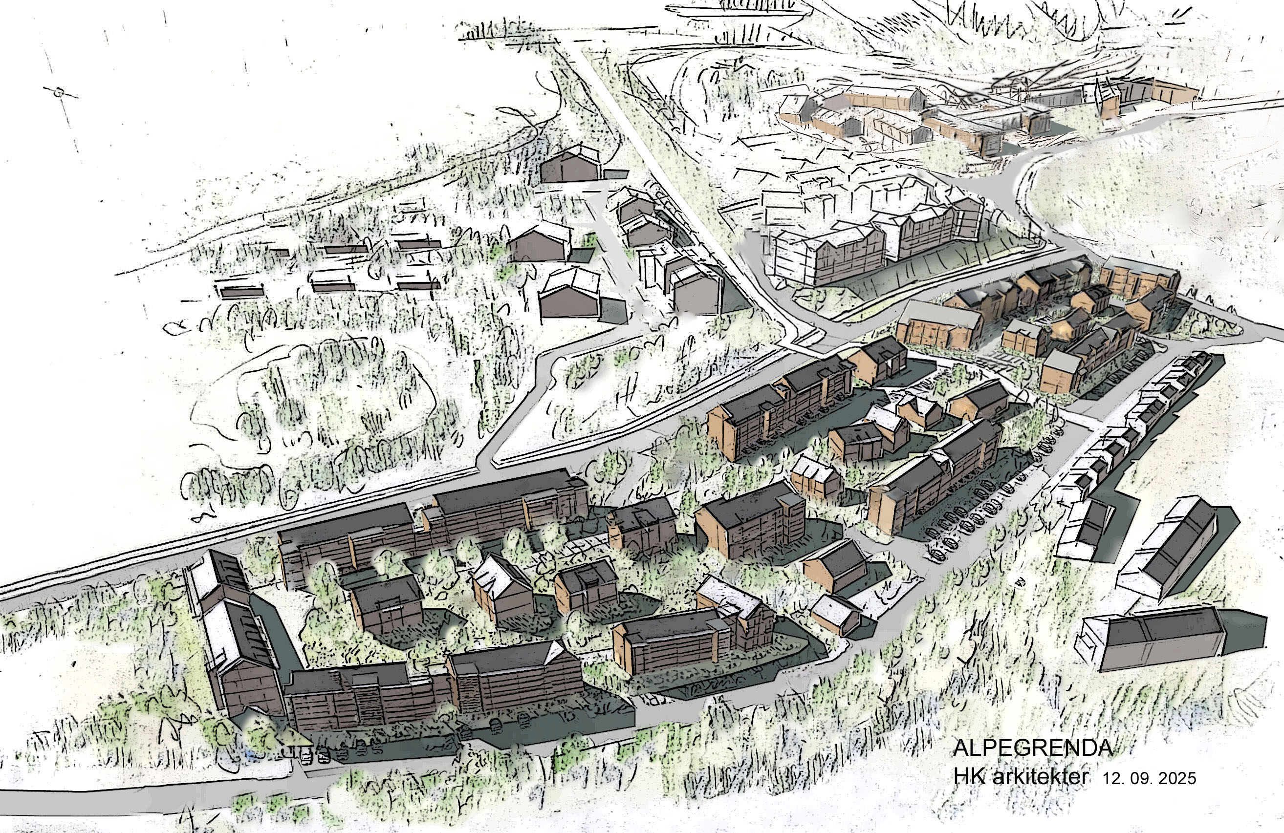 Alpegrenda er et pågående prosjekt i Hemsedal Fjellandsby. Illustrasjoner er utarbeidet som en del av reguleringsplanforslag for området. Prosjektet omfatter ca. 145 leiligheter og viser bebyggelsesstruktur, volumoppbygging og tilpasning til landskap og terreng.