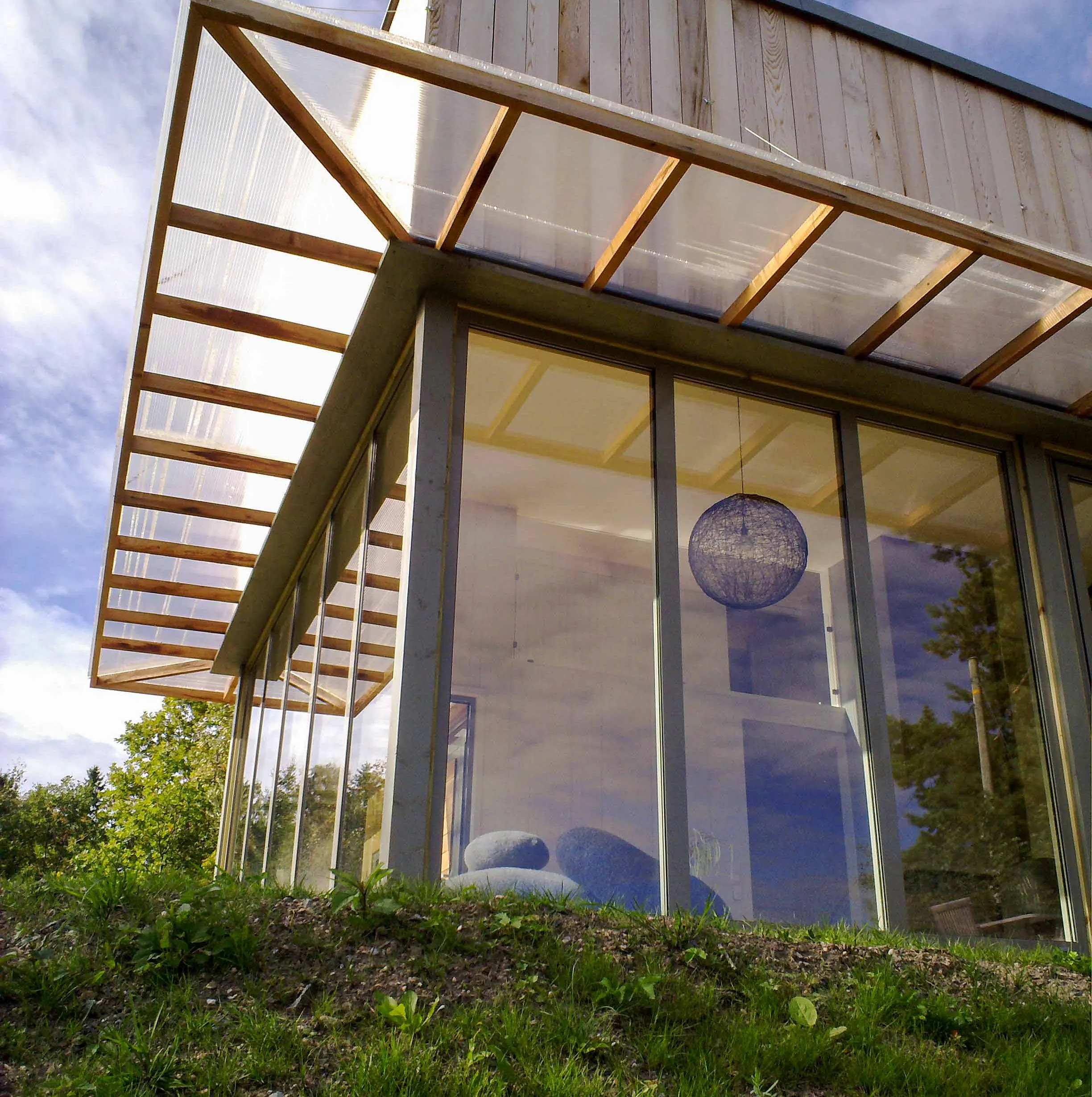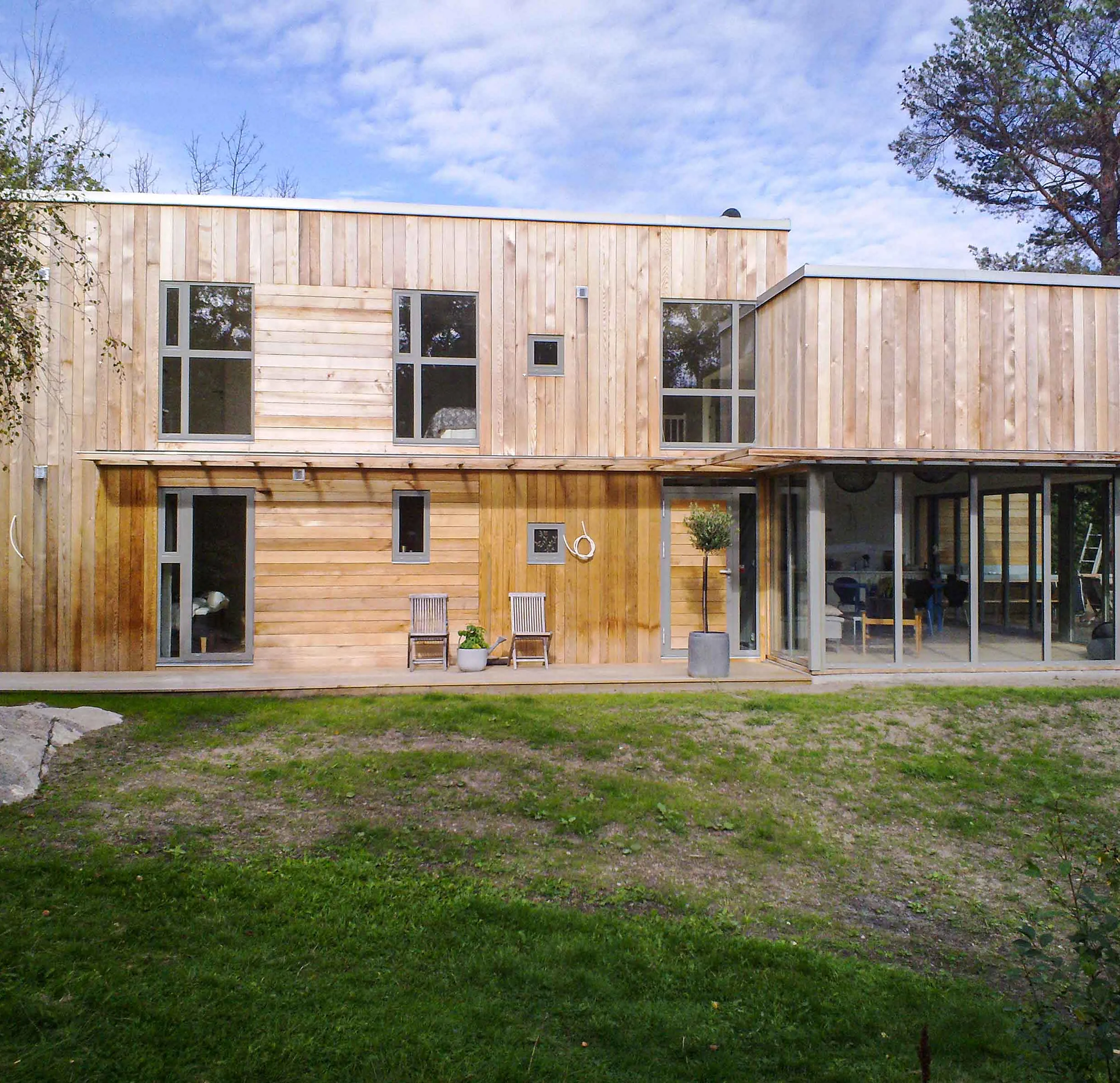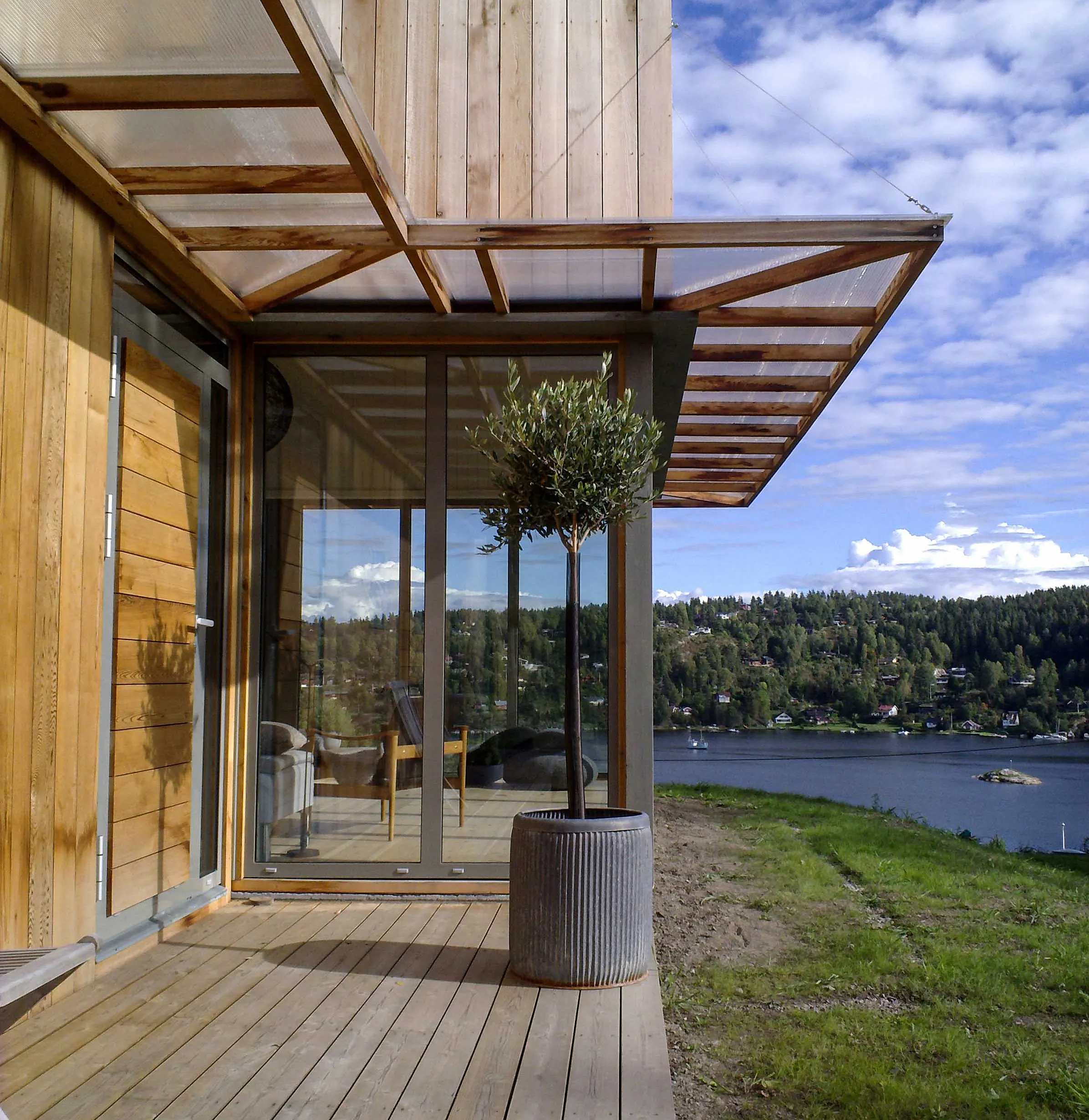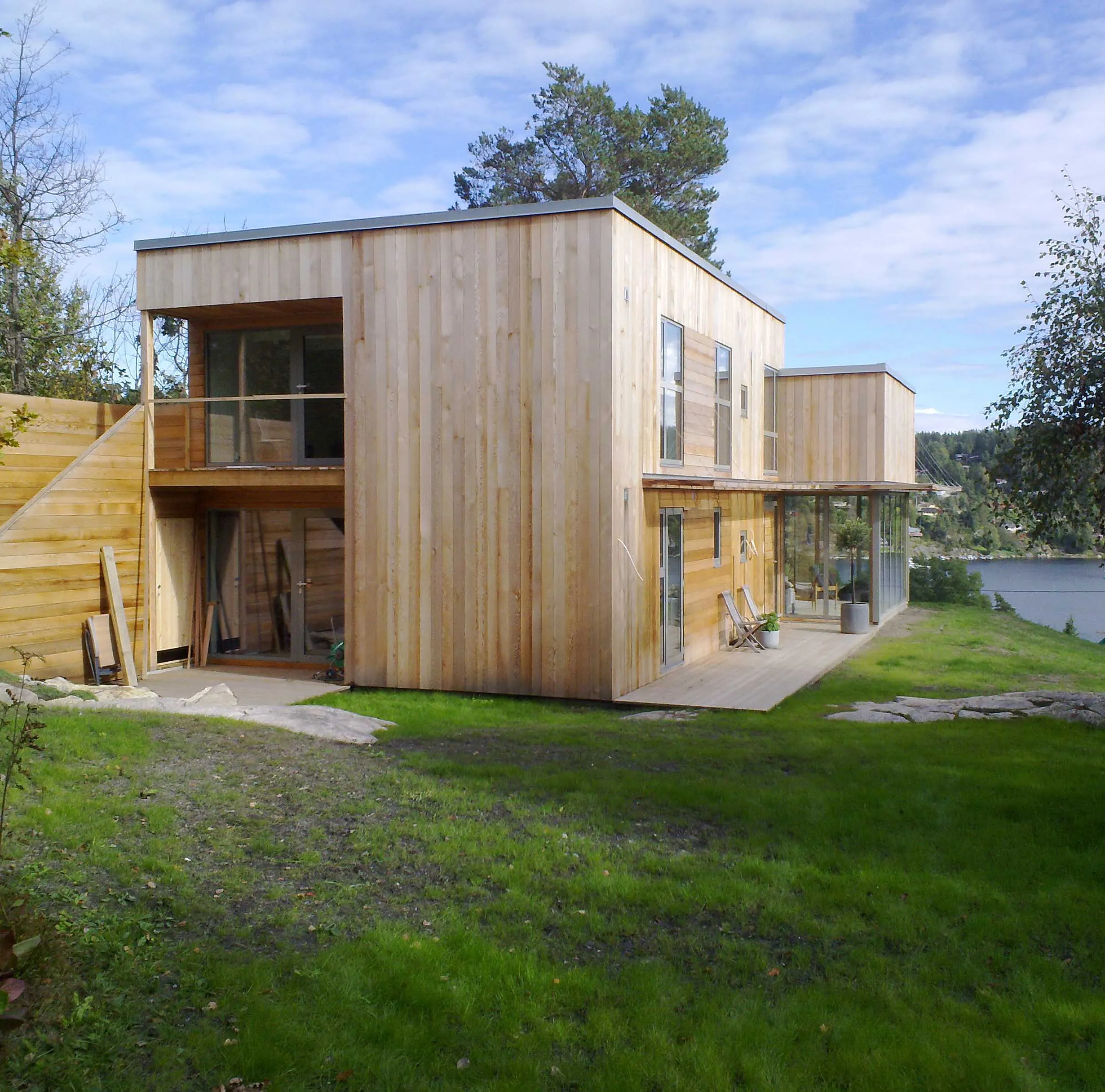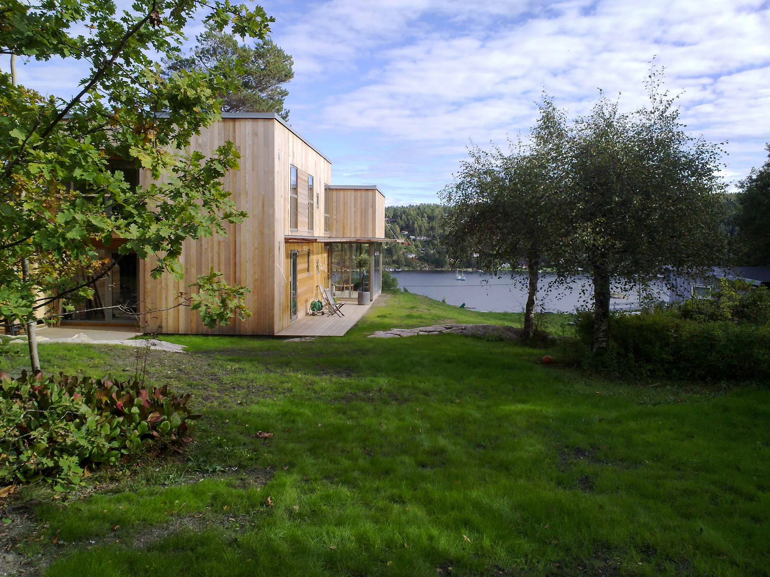 Utenfor Drøbak ligger denne private hytten som HK tegnet i 2009. Dette prosjektet tar utgangspunkt i en helhetlig og skånsom tilnærming til både arkitektur og natur. Hytten er utformet med enkelhet og harmoni som grunnprinsipp, samtidig som den tar hensyn til det eksisterende landskapet. For å minimere inngrep i terrenget er den nye fritidsboligen plassert på samme sted som den opprinnelige hytten. Kun mindre terrassering er utført i umiddelbar nærhet til bygget, og resten av terrenget er bevart i størst mulig grad. Materialvalget understreker prosjektets fokus på kvalitet og varighet. Fasader og konstruksjoner er utført hovedsakelig i treverk og glass, med yttervegger i slettpanel («låvepanel») kombinert med skyvbare skodder i liggende spiler. Fargepaletten består av matte naturtoner fra grått til brunt, supplert med kontrastfarger på utvalgte detaljer som dører og vindusomramminger for å skape dynamikk. For å gi fleksibilitet og komfort utendørs er det etablert midlertidige seil som skjermer uteplassene mot sol og nedbør, slik at uterommene kan brukes gjennom hele sesongen.