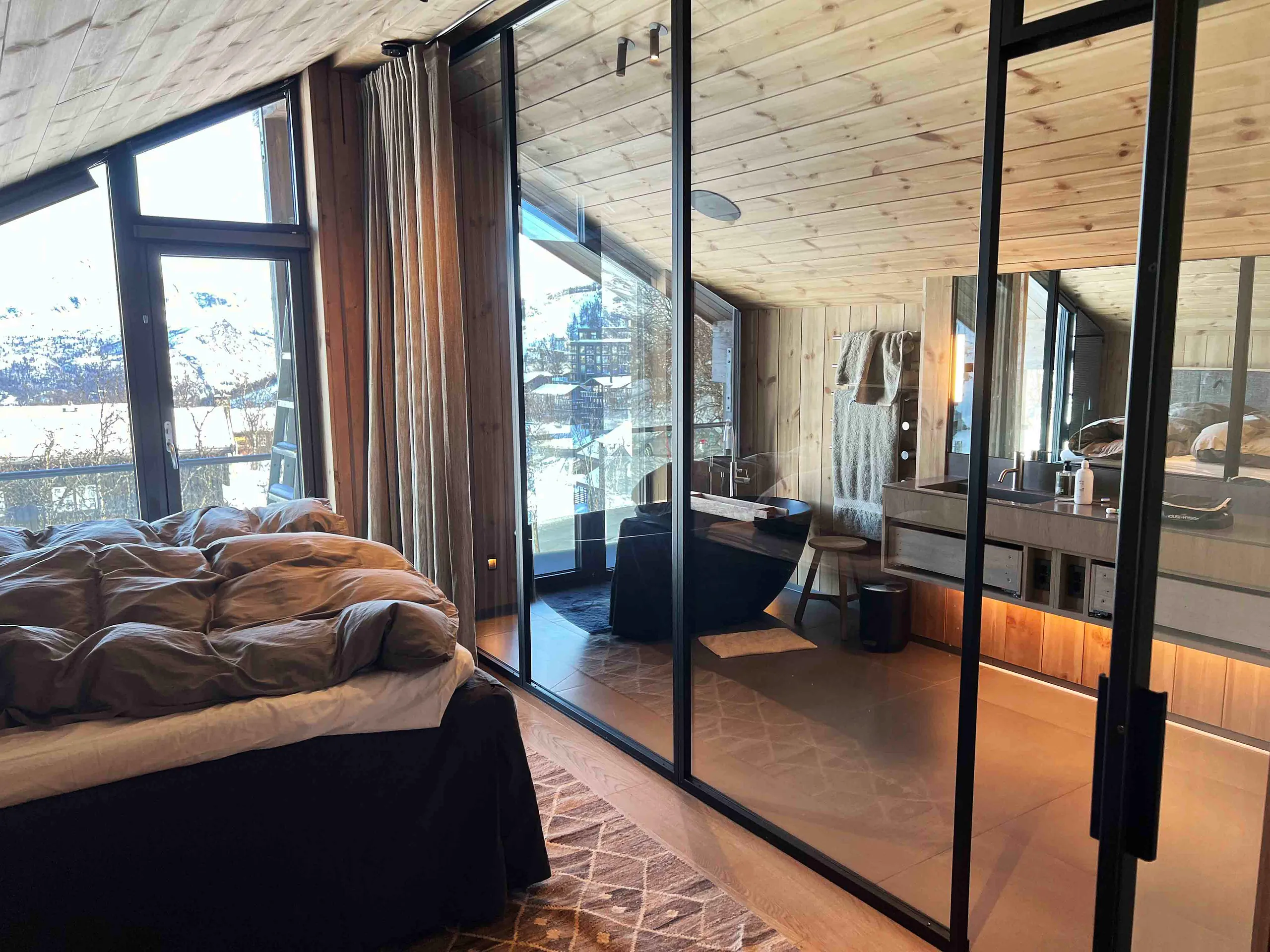 Hytta er tegnet som en videreføring av tradisjonell fjellarkitektur, med materialbruk som harmonerer med fjellandskapet. Fasaden består av liggende slett panel i dempet sort- og bruntoner for et naturlig uttrykk. Taket er tekket med torv, og synlige murer mot terrenget er utført i naturstein for å forsterke den stedstilpassede karakteren. Store vindusflater gir rikelig med lys og rammer inn utsikten, med vindusrammer som følger fargen på trekledningen for et helhetlig uttrykk. Hytten er delt i to hovedvolumer som ligger parallelt, der gavlene åpner opp for utsikten mot øst og vest. Møneretningen følger terrengets naturlige linjer mot sør og veien mot nord, mens de to bygningskroppene er vinklet for å skape lune uteplasser mot vest og sørvest, med utsikt over det åpne landskapet.