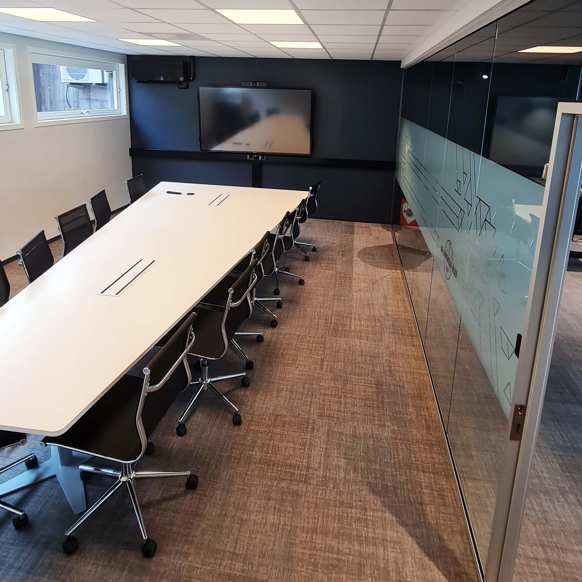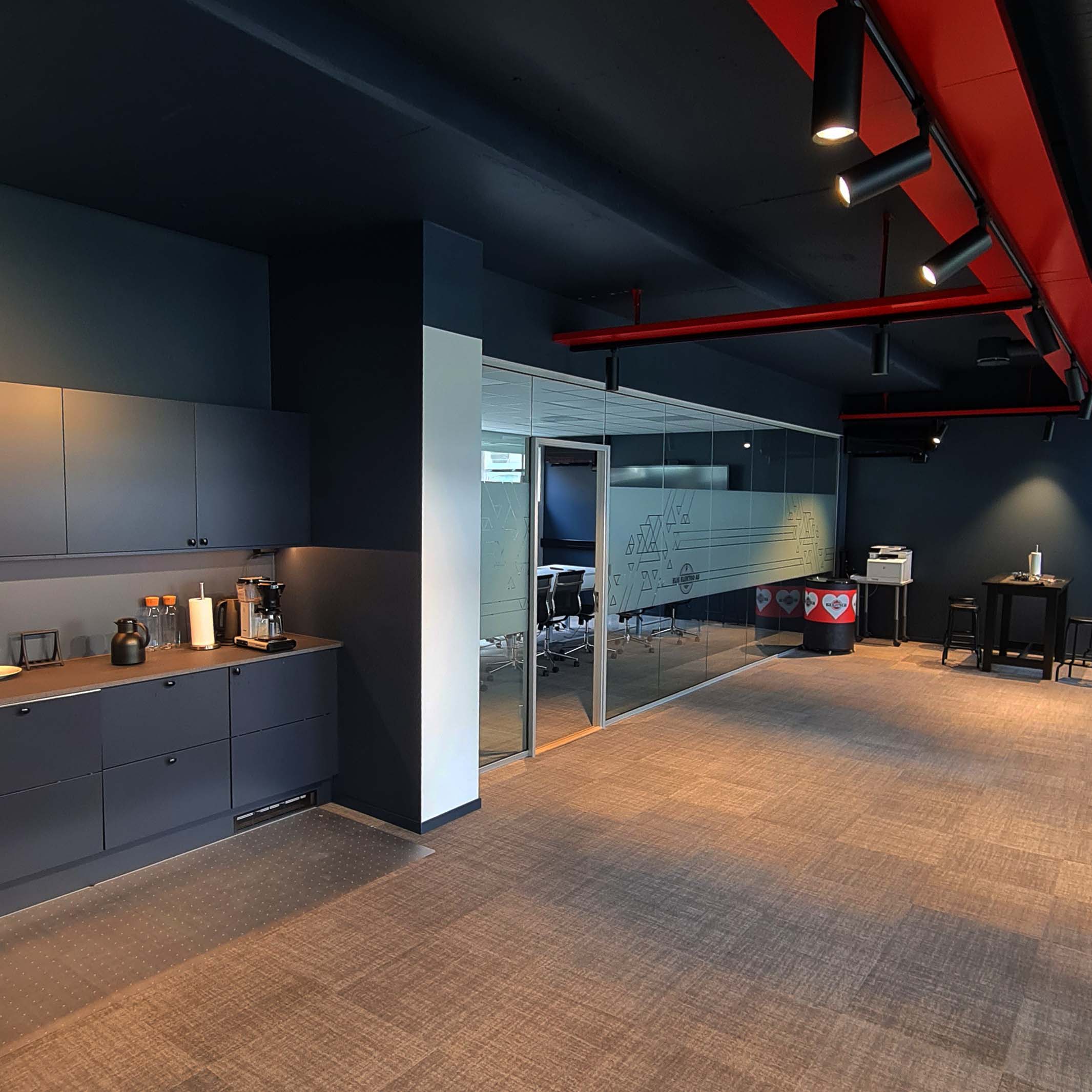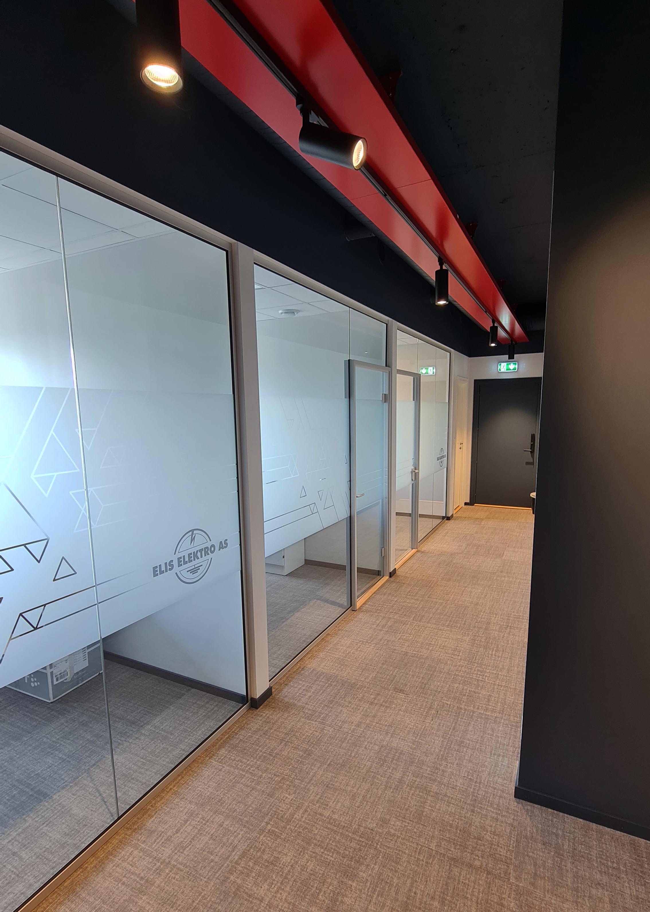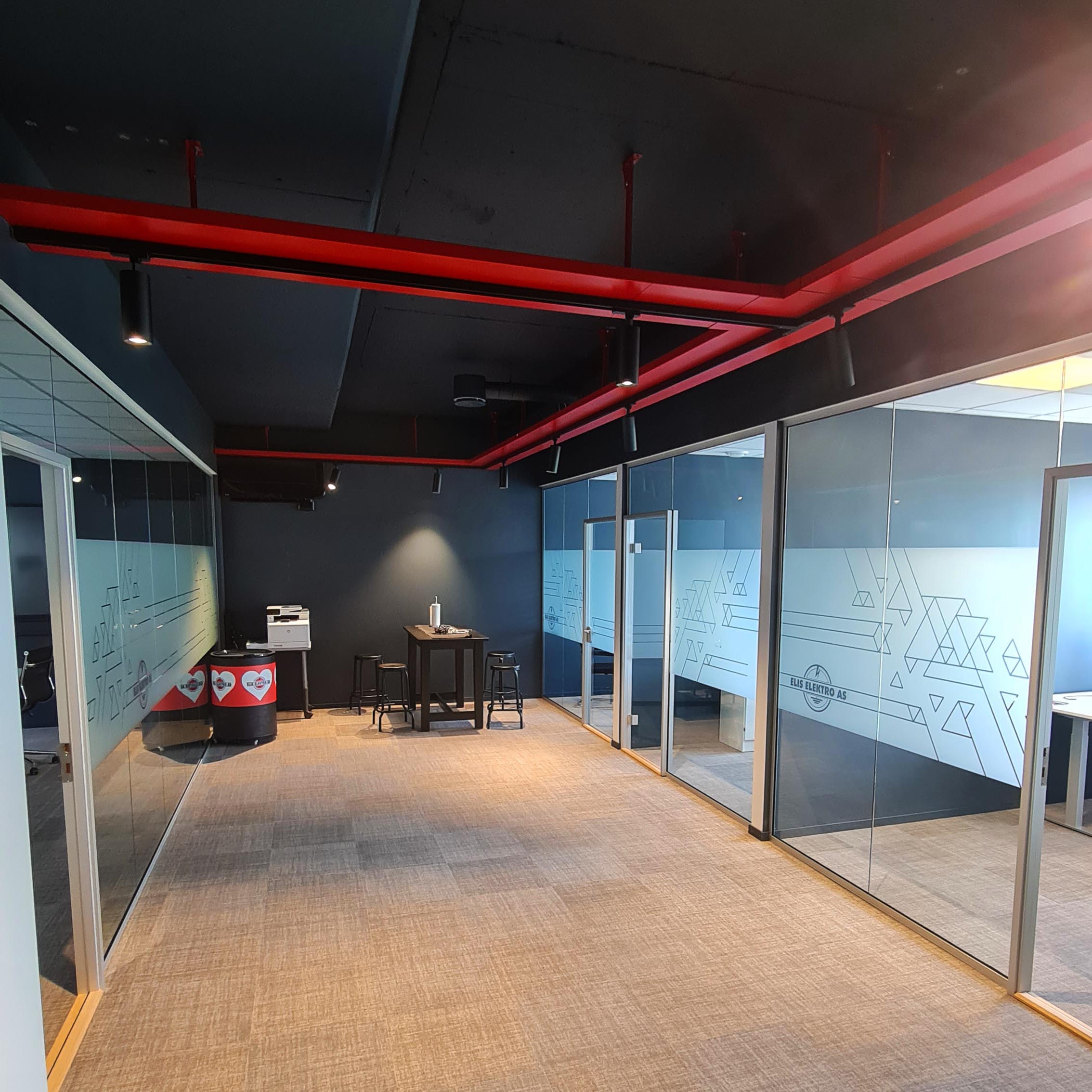 På oppdrag for Elis elektro fikk vi forespørsel om å tegne opp og designe deres utvidelse av kontorlokaler i Jerikoveien, i stil med lokalene vi hjalp de med i 2010. Målet var å få på plass cellekontorer og å kunne benytte lokalet som et showrom for hvordan elektriske løsninger kunne vises på en estetisk måte som passet sammen med resten av interiøret. Den mørke blåfargen skaper en lun atmosfære hvor kabelbrua får stikke seg ut i sin røde drakt og vise vei gjennom lokalet. En egen liten kjøkkenkrok og et mingleareal er basen i lokalet hvor cellekontorer og et møterom ligger ut mot fasadens.